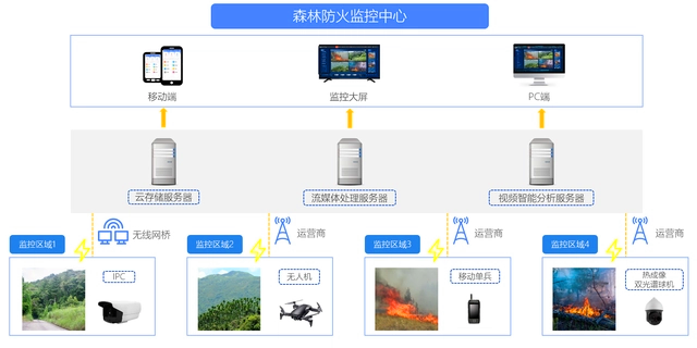 前端感知設備主要包括:手持終端設備(移動單兵、巡護終端等)、無人機、網絡攝像頭、熱成像雙光譜球機等,實現(xiàn)森林火情的數據采集與智能監(jiān)測;傳輸網絡通過租用運營商專線或4G、5G無線網絡接入前端、無人機等設備。森林防火監(jiān)控中心部署應用平臺服務器、視頻智能分析服務器、流媒體處理服務器、存儲系統(tǒng)、大屏顯示等設備,實現(xiàn)森林防火的可視化監(jiān)管應用。