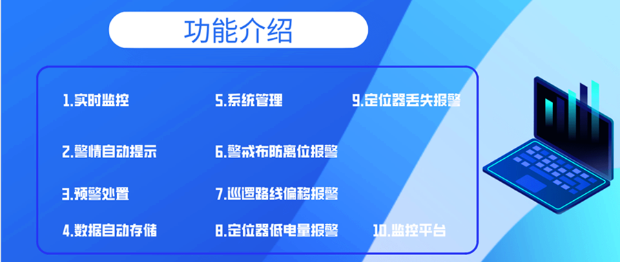 2、警情自動提示警戒布防部位離位報警;巡邏線路偏移報警;警戒布防部位離域報警;警戒布防部位入侵報警;電子巡查報警;定位器信號丟失報警;定位器被破壞報警;定位器低電量報警;追蹤器低電量報警。